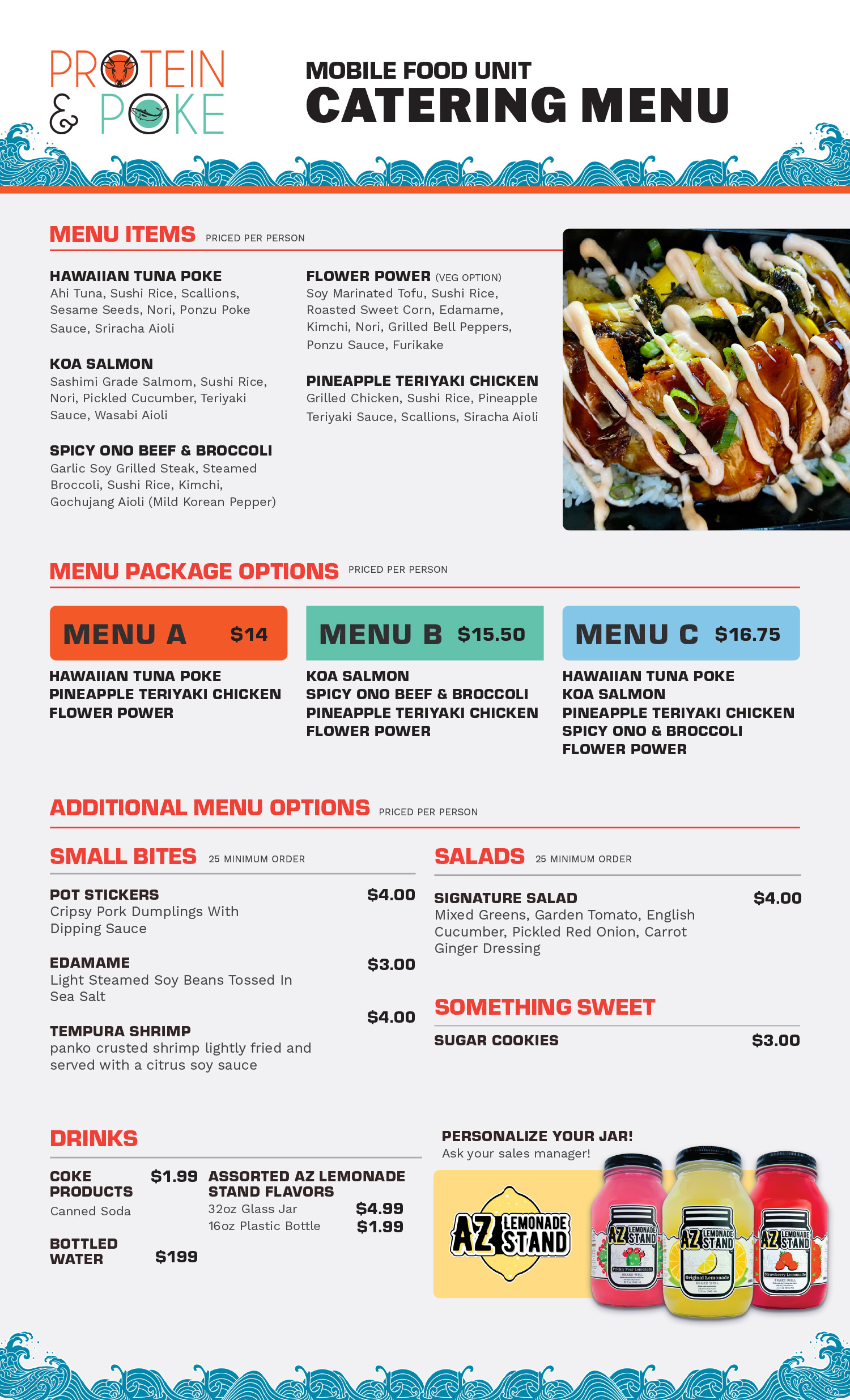 Please review the menu and respond back via email with what options you like best. Your sales manager will then share a quote with you! If you are working with a budget or want something custom please let your sales manager know.